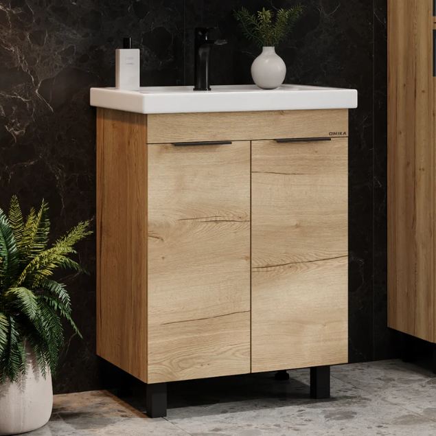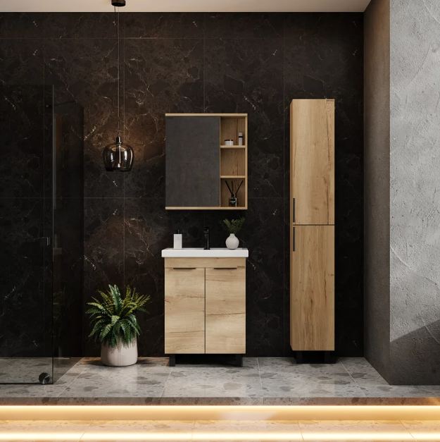 Отделка «дуб галифакс» придает модели выразительный и натуральный внешний вид с текстурой дерева, который гармонично вписывается в современные интерьерные решения. Ширина 60 см обеспечивает комфортное использование и достаточную вместительность для повседневных нужд.